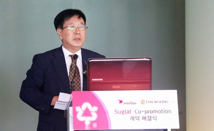 | ▲ 일본계 다국적 제약사 한국아스텔라스제약㈜(대표 정해도)과 당뇨치료제 ‘슈글렛(Suglat)’에 대한 코프로모션 계약 체결식을 진행중인 대웅제약 이종욱 사장 | ||