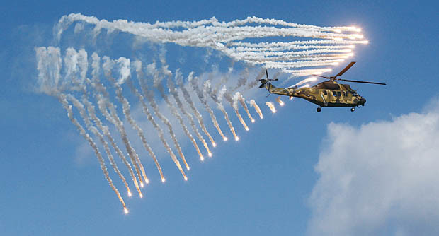 2014 육군항공사격대회가 열린 6일 경기도 양평 비승사격장에서 한국경 기동헬기 수리온(KUH-1)이 플레어(열추적회피사격)를 발사하고 있다.