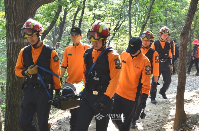 지난 7일 인천 남동소방서는 남동구 소래산 일대에서 유관기관과 합동으로 가을철 산행인구 증가에 따른 산악사고 대응 능력을 키우고 안전한 인명구조를 위해 산악구조 훈련을 실시했다. 사진은 이날 훈련에 참여한 구조대원들의 모습. (사진제공=남동소방서)