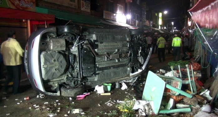 8일 밤 10시9분께 부산 동래구 금정시장에서 아반테 승용차가 천막 가건물로 된 포장마차 5개동을 덮쳐 2명이 숨지고 9명이 중경상을 입는 사고가 났다.사진은 사고현장의 모습./사진=부산소방본부 제공