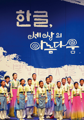 9일 오전 서울 종로구 세종문화회관에서 열린 568돌 한글날 경축식에서 안양시립소년소녀 합창단이 축하공연을 하고 있다.