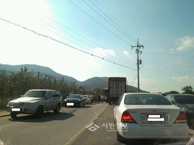 무을생태고을버섯 축제가 열린 안곡리 춤새권도농교류센터 주변에서 차들이 정체로 인해 움직이지 못하고 있다.