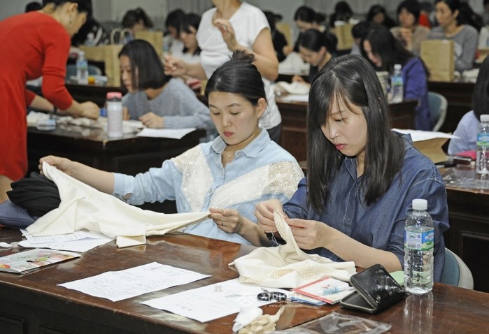서울 광진구는 최근 구청 대강당에서 ‘제9회 임산부의 날’을 기념해 '축복 받은 아가! 준비된 엄마 행복'행사를 개최했다. 사진은 '임산부의 날’행사에서 임산부들이 바느질로 배냇저고리를 만드는 모습. (사진제공=광진구청)