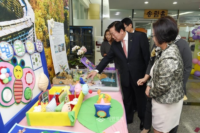 경기 광주시는 최근 시청 대회의실과 중회의실에서 어린이집 원장과 보육교사, 학부모, 보육원생 등 1000여명이 참석한 가운데 '제10회 보육주간 행사'를 개최했다. 사진은 보육교사들이 직접 제작한 작품들을 조억동 광주시장이 보고 있는 모습. (사진제공=광주시청)