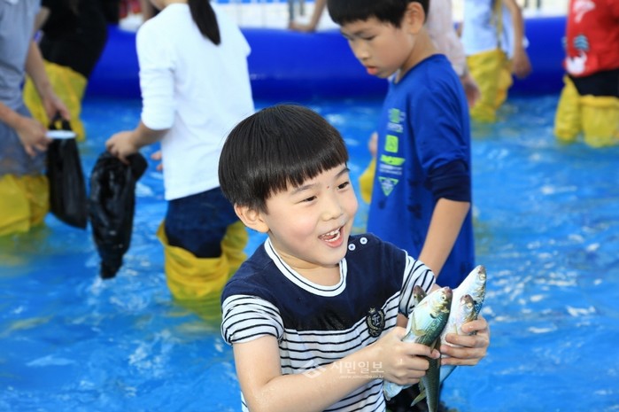 지난 12일 막을 내린 인천시 남동구가 주최한 '제14회 인천소래포구 축제'가 열린 소래포구 및 소래습지생태권을 방문한 아이들이 맨손고기잡이 체험 행사에 참가해 물고기를 잡아 올리고 기뻐하고 있다. (사진제공=남동구청)
