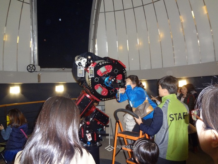 최근 충남 아산시 청소년교육문화센터가 센터내 천문대에서 시민과 학생 500여명이 참여한 개기월식 공개관측회 '불개가 삼킨 달' 행사를 열고 개기월식·별자리에 대한 강연과 체험부스, 퀴즈대회 등을 운영했다. 사진은 천체망원경을 통해 개기월식을 관찰하는 참여자의 모습. (사진제공=아산시청)