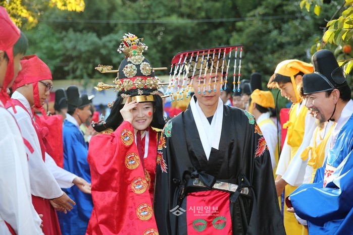지난 11일 서울 성북구 장위동 김진흥 가옥에서 조선시대 공주와 부마의 전통방식 궁중혼례를 진행하는 '장위부마축제'가 열렸다. 사진은 이날의 부마와 공주인 이정희씨(오른쪽)와 석혜진씨(왼쪽)의 모습. (사진제공=성북구청)