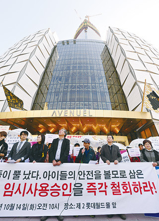 국내 최대 규모의 쇼핑몰 ‘제2롯데월드 에비뉴엘 월드타워점’이 전격 오픈한 14일 오전 서울 송파구 잠실 롯데 에비뉴엘 월드타워점 앞에서 송파시민연대 관계자 및 주민들이 제2롯데월드 임시개장 반대를 촉구하는 기자회견을 하고 있다.