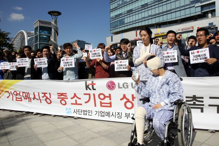 14일 오전 경기도 판교테크노밸리 유스페이스광장에서 사단법인 기업메시징 부가통신사업자협회 장준호 협회장이 회원사 기업 임직원 100여명과 함께 창조중소기업들이 일군 기업메시지시장에서 KT와 LGU+의 불공정 경쟁을 성토하고 공정거래위원회의 실효성 있는 제재를 촉구하는 규탄대회에서 어려움을 겪고있는 업계를 표현하는 환자퍼포먼스를 연출하고 있다.