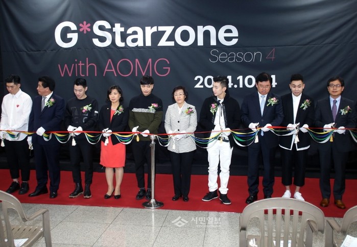 지난 14일 오후 4시 서울 강남구 압구정로데오역에서 열린 저소득 청소년 지원프로그램 ‘G+ 스타존 시즌4 오픈식’에 참석한 신연희 강남구청장(가운데)이 가수 박재범(오른쪽), 사이먼디(왼쪽)와 테이프 커팅을 하고 있다. (사진제공=강남구청)