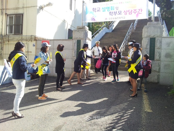 지난 14일 인천시 중부경찰서 교통안전계 직원들이 민·관 합동 릴레이 스쿨존 캠페인 2번째 장소인 송월초등학교 앞에서 녹색어머니회원 등과 함께 하교하는 아이들을 대상으로 '무단횡단 금지', '자전거 보도운행' 금지 등이 담긴 관련 전단지를 배부하고 있다. (사진제공=중부경찰서)