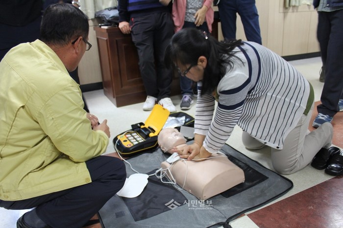 15일 경기 이천교육지원청이 학교에서 발생할 수 있는 각종 안전사고 및 응급상황 발생시 초기대응능력 향상과 재난안전문화 확산을 위한 심폐소생술 교육을 이천교육지원청 제1회의실에서 실시했다. 사진은 이날 교육에 참석해 심폐소생술을 실습 중인 직원들의 모습. (사진제공=이천교육지원청)