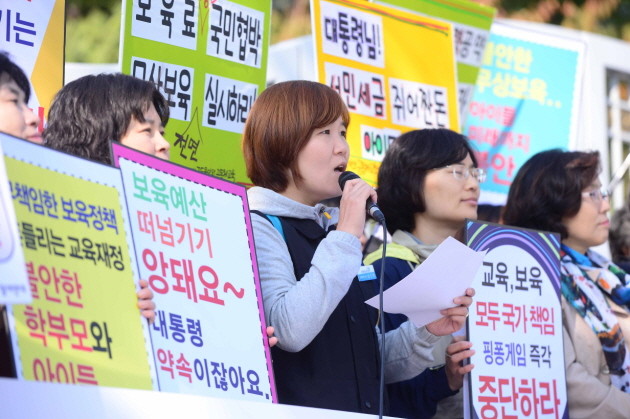 15일 오전 서울 세종로 정부서울청사 앞에서 보육정책 정상화를 바라는 노동·시민단체와 학부모 등이 기자회견을 열고 정부가 보육·유아교육의 국가완전책임제를 실시하고 공공성이 강화된 무상보육을 시행할 것을 촉구하고 있다.