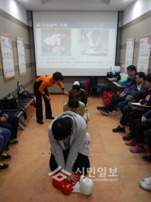 지난 15일 인천시 남부소방서 홍보교육팀은 지역내 사회복지시설인 미추홀하우스 직원 및 장애인들을 대상으로 화재예방교육 및 소방안전 체험교실을 운영했다. 사진은 심정지 환자 발생시에 대비해 심폐소생술을 배우고 있는 시설 관계자들의 모습. (사진제공=남부소방서)