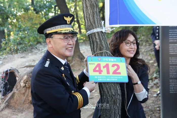 지난 15일 경기 구리경찰서가 아차산 일대에서 범죄, 조난 등의 응급상황이 발생할 경우 정확한 신고를 돕기 위해 총 400개의 위치식별 표지판인 '아차산 메아리' 설치를 완료하고 기념행사를 열었다. 사진은 설치된 아차산 메아리를 들어보이는 관계자들의 모습. (사진제공=구리경찰서)