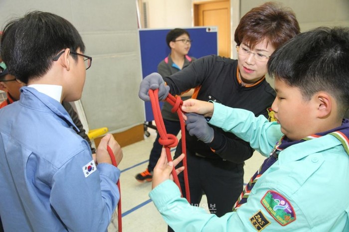 서울 동작소방서는 지난 16일 동작소방서 3층 강당에서 은로초등학교 컵스타우트 학생 40명에게 화재발생시 대처할 수 있도록 커튼을 이용한 피셔맨 매듭법과 몸을 고정시키는 고정 매듭법 등을 교육했다. 사진은 매듭법을 배우고 있는 컵스카우트 학생들의 모습. (사진제공=동작소방서)