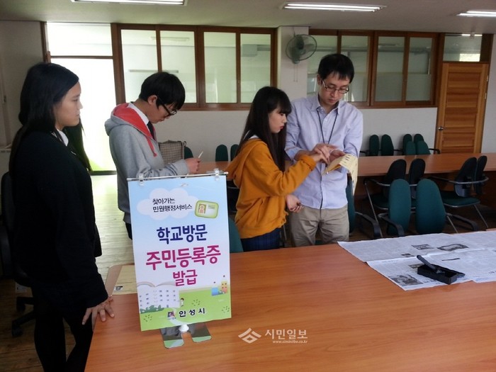 경기 안성시는 최근 지역내 학교를 찾아가 주민등록증을 발급해주는 ‘생애 첫 주민등록증 발급 서비스’를 실시했다. 사진은 발급서비스 담당공무원이 주민등록증 발급을 위해 학생들의 지문을 채취하고 있는 모습. (사진제공=안성시청)