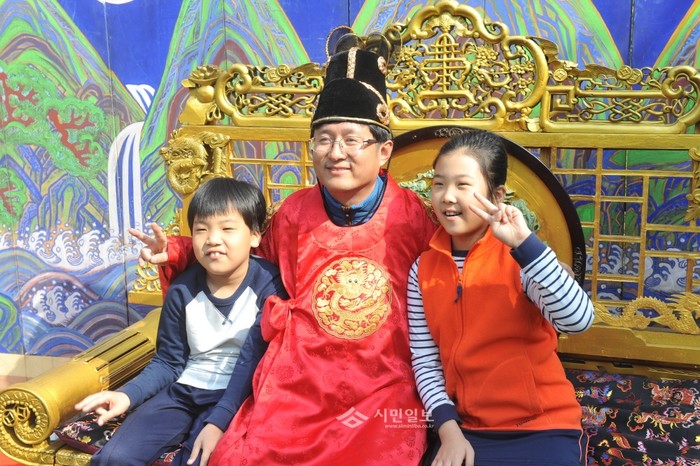 노원구 월계동 비석골 근린공원에서 지난 18일 내시와 궁녀의 궁중생활을 엿볼 수 있는 '2014 제6회 초안산 문화제'를 열었다. 사진은 김성환 구청장(가운데)이 어린이들과 기념사진을 찍고 있는 모습. (사진제공=노원구청)