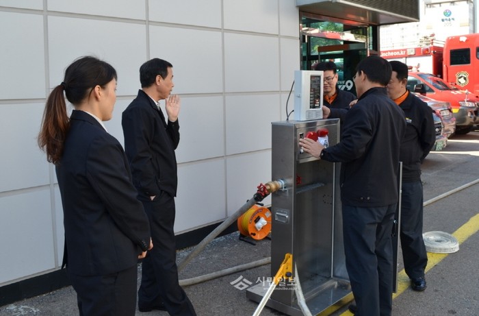 인천시 남동소방서는 시민들의 소방안전 체험교육의 효과를 증진시키기 위해 자체적으로 '교육용 이동식 옥내소화전'을 제작, 최근 시험운행을 실시했다. 사진은 이동식 옥내소화전을 점검하고 있는 소방서 관계자들의 모습. (사진제공=남동소방서)