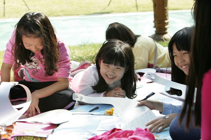지난 18일 서울 성동구 응봉공원(대현산 배수지)에서 시인 김소월의 삶과 문학을 기념하고 그의 문학세계를 계승하고자 열린 ‘제4회 소월백일장’에 참가한 아이들이 종이모자에 시쓰기 연습을 하고 있다. (사진제공=성동구청)