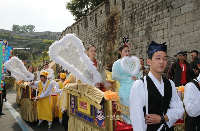 지난 19일 서울 성북구 삼선동의 서울성곽에서 '제4회 삼선동 선녀축제'가 열렸다. 사진은 가마를 타고 서울성곽~장수마을~돈암시장~삼선분수마루를 순회하고 있는 삼선녀들의 모습. (사진제공=성북구청)