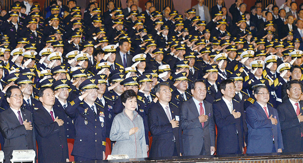 박근혜 대통령이 21일 오후 서울 종로구 세종대로 세종문화회관에서 열린 ‘제69주년 경찰의 날 기념식’에 정종섭 안전행정부 장관, 강신명 경찰청장 등과 함께 참석해 국기에 대한 경례를 하고 있다.