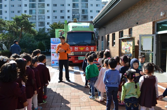 인천남동소방서 구월119안전센터는 22일 오전 복자유치원을 방문해 원생 250명을 대상으로 이동안전체험차량 및 물소화기를 이용한 소방안전 체험교육을 실시했다. 사진은 소방관에게 화재발생시 대피요령 등을 교육받고 있는 아이들의 모습. (사진제공=인천남동소방서)