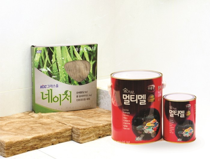 | ▲ KCC가 국제 공기청정 및 그린환경 전시회에 참가해 선보인 친환경 건축자재 HB마크 최고등급인 클로버 5개를 받은 제품들. 국내 기술 최초로 식물 추출 성분으로 만튼 친환경 보온단열재 '그라스울 네이처'(왼쪽)와 친환경 수성페인트인 '숲으로 멀티멜골드'. | ||