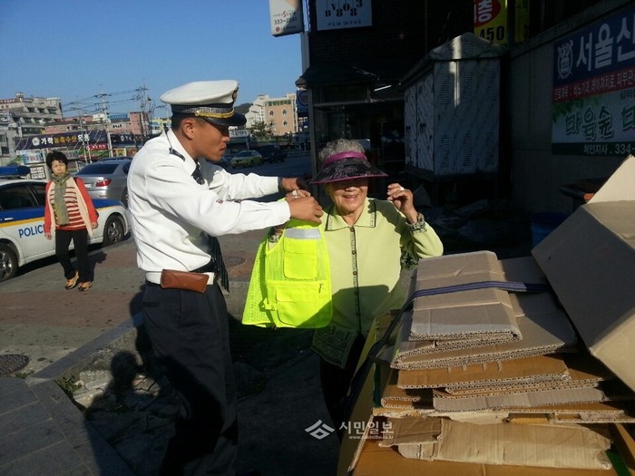 경기 용인동부경찰서는 최근 폐지수거 노인들의 교통사고 예방을 위해 교통안전교육 및 야광조끼 전달을 실시했다. 사진은 경찰이 제공한 야광조끼를 입고 있는 노인의 모습. (사진제공=용인동부경찰서)
