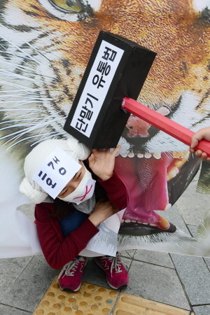 22일 오후 서울 서대문구 유플렉스 앞 광장에서 정의당, 참여연대 등 시민사회단체 주최로 열린 ‘단통법 대폭 보완 및 단말기 가격 거품 제거, 통신비 획기적 인하 촉구’ 공동기자회견에서 참가자들이 '단말기 유통법 망치'로 스마트폰 사용자를 때리는 퍼포먼스를 하고 있다.