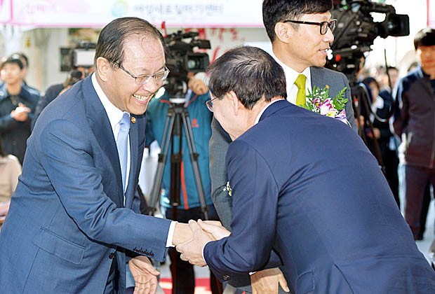 황우여(왼쪽) 사회부총리 겸 교육부 장관과 박원순 서울시장이 22일 오전 서울 종로구 세종로 광화문광장 북측광장에서 열린 ‘2014 리스타트 잡페어-새 희망의 일터로’에서 인사를 나누고 있다.