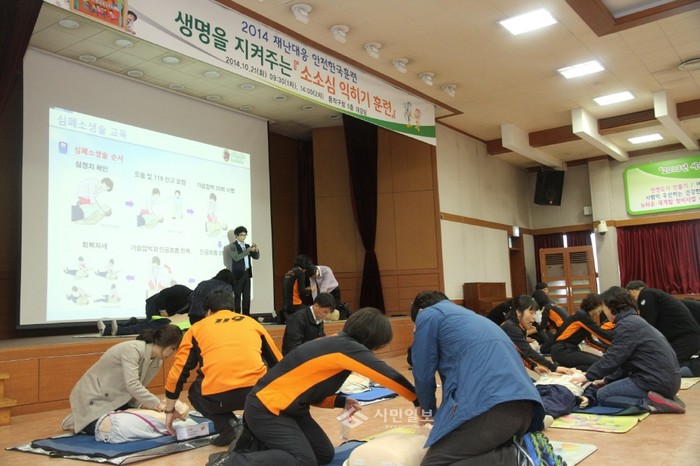 지난 21일 서울 동작소방서 홍보교육팀은 '2014 재난대응 안전한국훈련'의 일환으로 동작구청 5층 대강당에서 구청 직원 및 자율방재단 회원, 주민 등 100여명이 참석한 가운데 '소(화기)·소(화전)·심(폐소생술) 익히기 체험훈련'을 실시했다. 사진은 심폐소생술 교육 모습. (사진제공=동작소방서)