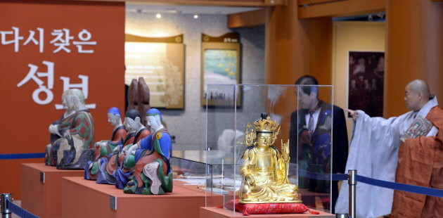 22일 오전 서울 종로구 대한불교 조계종 한국불교역사문화기념관에서 '다시 찾은 성보전'이 열린 가운데 관람객들이 최근 도난됐다가 회수된 불교문화재들을 살펴보고 있다. 서울지방경찰청 광역수사대는 전국 20개 사찰에서 도난된 불교문화재를 개인 창고에 은닉한 혐의(문화재보호법 위반)로 사립박물관장 권모(73) 씨와 매매를 알선한 경매업체 대표 이모(53ㆍ여) 씨를 불구속 입건하고 해외로 도피한 문화재 매매업자 정모(66) 씨를 쫓고 있다고 22일 밝혔다.