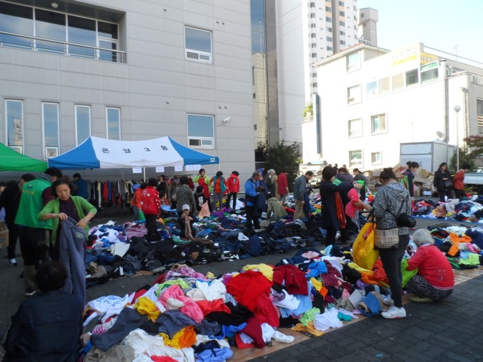 지난 22일 충남 아산시 온양3동 새마을남·녀지도자협의회가 온양3동 주민센터 앞 주차장에서 지역단체들의 후원을 받아 다양한 물건을 판매하는 '불우이웃돕기 나눔 바자회'를 열었다. 바자회 수익금전액은 지역내 어려운 이웃을 위해 사용될 예정이다. 사진은 바자회에 참여한 주민들의 모습.(사진제공=아산시청)
