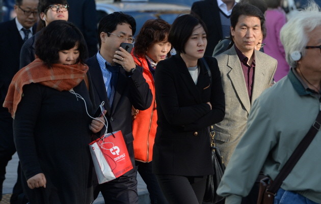 일 년 중 서리가 내리기 시작한다는 상강(霜降) 절기인 23일 오전 서울 광화문네거리에서 시민이 몸을 움츠린 채 출근길 발걸음을 재촉하고 있다.