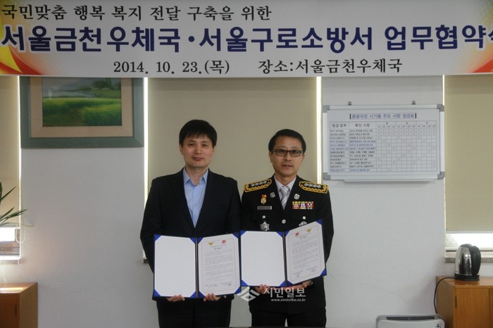 서울 구로소방서는 23일 오전 금천구에 위치한 서울금천우체국 5층 국장실에서 김송연 구로소방서장과 김동혁 서울금천우체국장 등 관계자들이 참석한 가운데 '국민 맞춤행복 복지 전달구축을 위한 업무협약식'을 진행했다. 사진은 이날 협약을 체결하고 기념촬영 중인 김 서장과 김 국장의 모습. (사진제공=구로소방서)