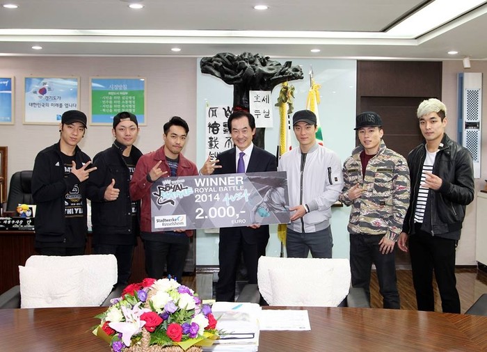 지난 22일 경기 의정부시에, 독일 하노버시에서 개최된 세계 메이저 대회인 '2014 Battle of the Year'에서 Best Show 부분 1위, Battle 부분 2위로 준우승을 차지한 비보이팀 퓨전 MC 팀원들이 방문했다. 사진은 안병용 의정부시장(가운데)과 팀원들이 기념촬영을 하는 모습. (사진제공=의정부시청)