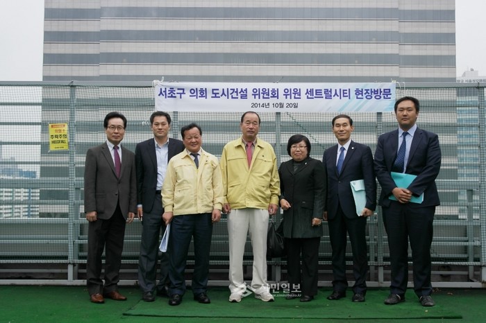 | ▲ 지난 20일 도시건설위원회 위원들이 센트럴시티를 방문해 현장점검 후 기념촬영한 모습. (사진제공=서초구의회) | ||