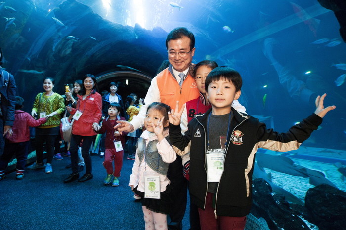 | ▲ 한화건설 이근포 사장이 한화그룹 창립 62주년 기념 사회공헌활동으로 어린이들과 ‘한화 아쿠아플라넷 일산’을 관람하고 있다. (사진제공=한화건설) | ||