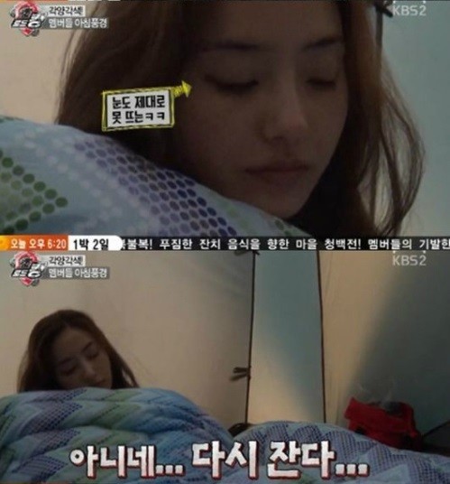 또 한채영은 잠을 이기지 못하고 다시 누워 잠들었다. 이후 한채영은 인터뷰에서 “한 번도 메이크업을 안 한 채 방송을 한 적이 없다. 텐트 룸메이트 소현에게 아이라이너를 빌려달라고 했었다” 고 털어놨다.