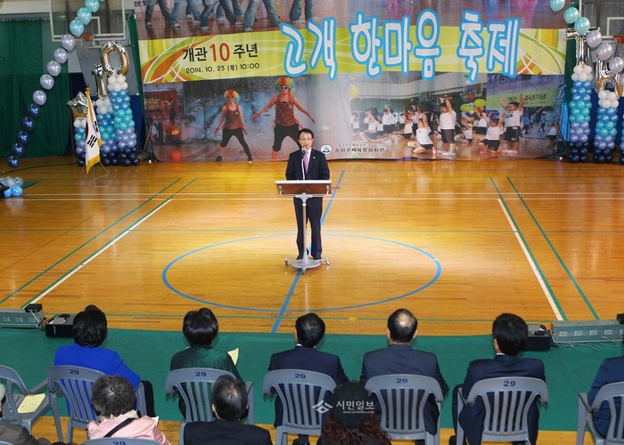서울 송파구의회는 최근 구 '체육문화회관 개관 10주년 기념식'에 참석해 수강생들의 작품전시회 및 발표회를 관람했다. 사진은 노승재 부의장이 기념식에 참석한 관계자 및 주민들을 대상으로 축사 중인 모습. (사진제공=송파구의회)