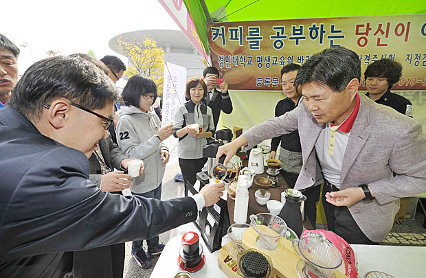 새누리당 홍문종 의원이 25일 의정부시 예술의 전당에서 열린 ‘제 1회 평생학습 박람회’ 경민대학교 평생교육원 부스를 방문, 김정욱(딸깍발이 대표) 교수에게 핸드드립을 배우며 1일 바리스타 체험을 하고 했다.