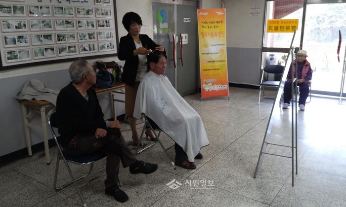 경기 아산시 온양6동 행복키움추진단은 주민자치위원회, 아나바다 운동 봉사단체 샘물 두레박 마을과 함께 최근 읍내 주공아파트 경로당에서 노인들을 대상으로 미용봉사를 실시했다. 사진은 경로당 노인에게 이·미용 봉사 중인 봉사자의 모습. (사진제공=아산시청)