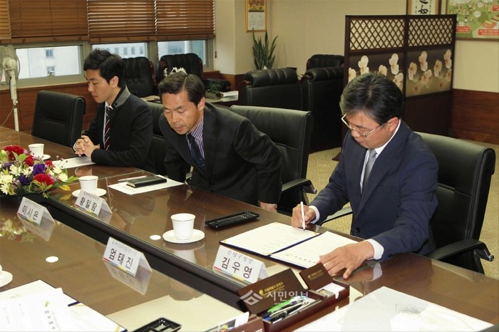 최근 김우영 서울 은평구청장이 홈스테이인코리아 협동조합과 양 단체간 관광문화 발전과 홈스테이 사업 활성화를 위해 상호 적극 협력한다는 내용의 업무협약을 체결하고 협약서에 서명을 하고 있다. (사진제공=은평구청)