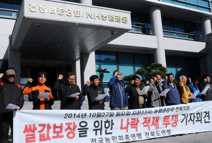 전국농민회총연맹 전북도연맹은 27일 오전 전북 전주시 농협중앙회 전북본부 앞에서 나락적재투쟁 기자회견을 개최했다.