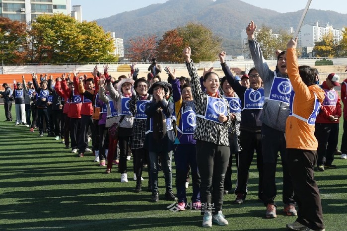 경기 광주시 생활체육회는 생활체육인의 소통과 단합을 위한 '어울림 한마당 대회'를 28일 광주공설운동장에서 개최했다. 사진은 이날 체육회에 참가한 생활체육회 회원들이 '파이팅'을 외치는 모습. (사진제공=광주시청)