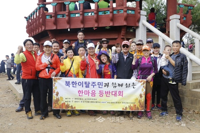 최근 경기 광명경찰서는 소하동과 노온사동에 걸쳐 있는 구름산에서 사회정착 생활에 어려움을 겪고 있는 북한이탈주민과 함께하는 등반대회를 열었다. 사진은 광명경찰서 직원과 관련단체 및 북한이탈주민이 구름산 정상에서 기념촬영한 모습.(사진제공=광명경찰서)