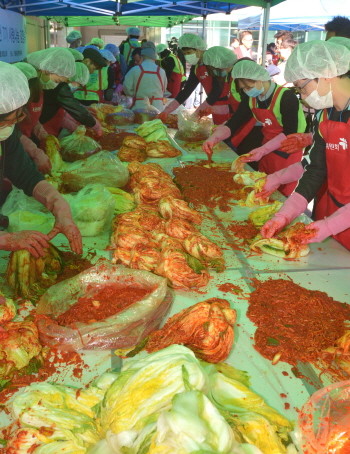 기획재정부 복권위원회의 제7기 행복공감봉사단원들이 28일 오전 서울 영등포장애인복지관에서 지역 저소득 소외 이웃들을 위한 김장봉사활동을 하고 있다. 봉사단은 1,000여포기의 김장김치를 담그고 저소득층 200가정에 배달할 계획이다.