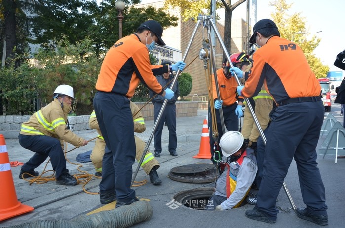 인천 중부소방서는 29일 중구 신포동에 위치한 KT항동지점 지하통신구 맨홀에서 지하전력구 사고 대비 현장대응능력을 제고하고자 작업 중인 근로자가 의식을 잃은 상황을 가정해 인명구조훈련을 실시했다. 사진은 소방관들이 밧줄로 구조자를 끌어올리는 모습. (사진제공=중부소방서)