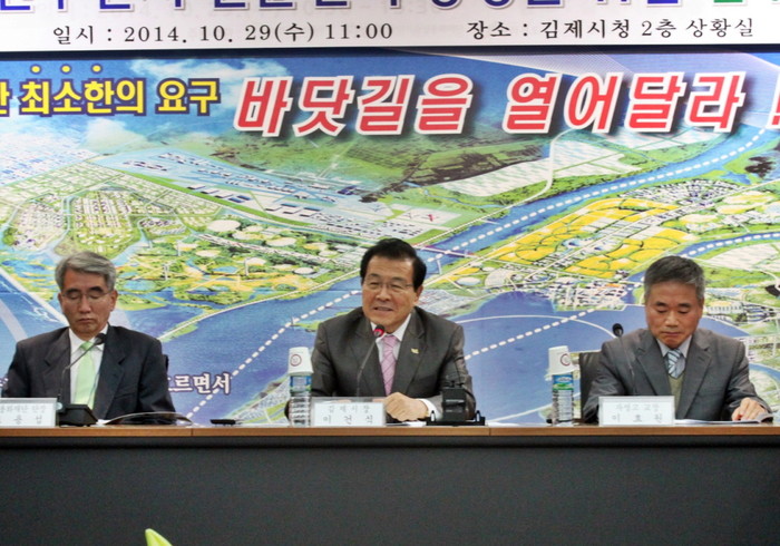 29일 전북 김제시청에서 이건식 김제시장(가운데)과 농업기술실용화재단 조용섭 종자사업단장(왼쪽), 김제자영고 이효원 교장(오른쪽)이 민간육종연구단지 입주예정 19개 기업 대표 등과 전문인력 양성을 골자로 산학관 상호협력을 논의하고 있다. 이들 기관 및 기업은 이 자리에서 양해각서(MOU)를 체결하고 상호 공동노력을 하기로 했다.